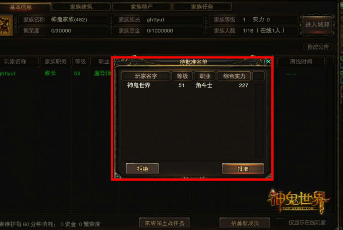 5、点击“预备族员”按钮,即可看到申请加入的玩家信息(包含等级、职业、综合实力),对方军团可选择“批准”按钮同意申请人的请求,也可选择“拒绝”按钮拒绝该请求。