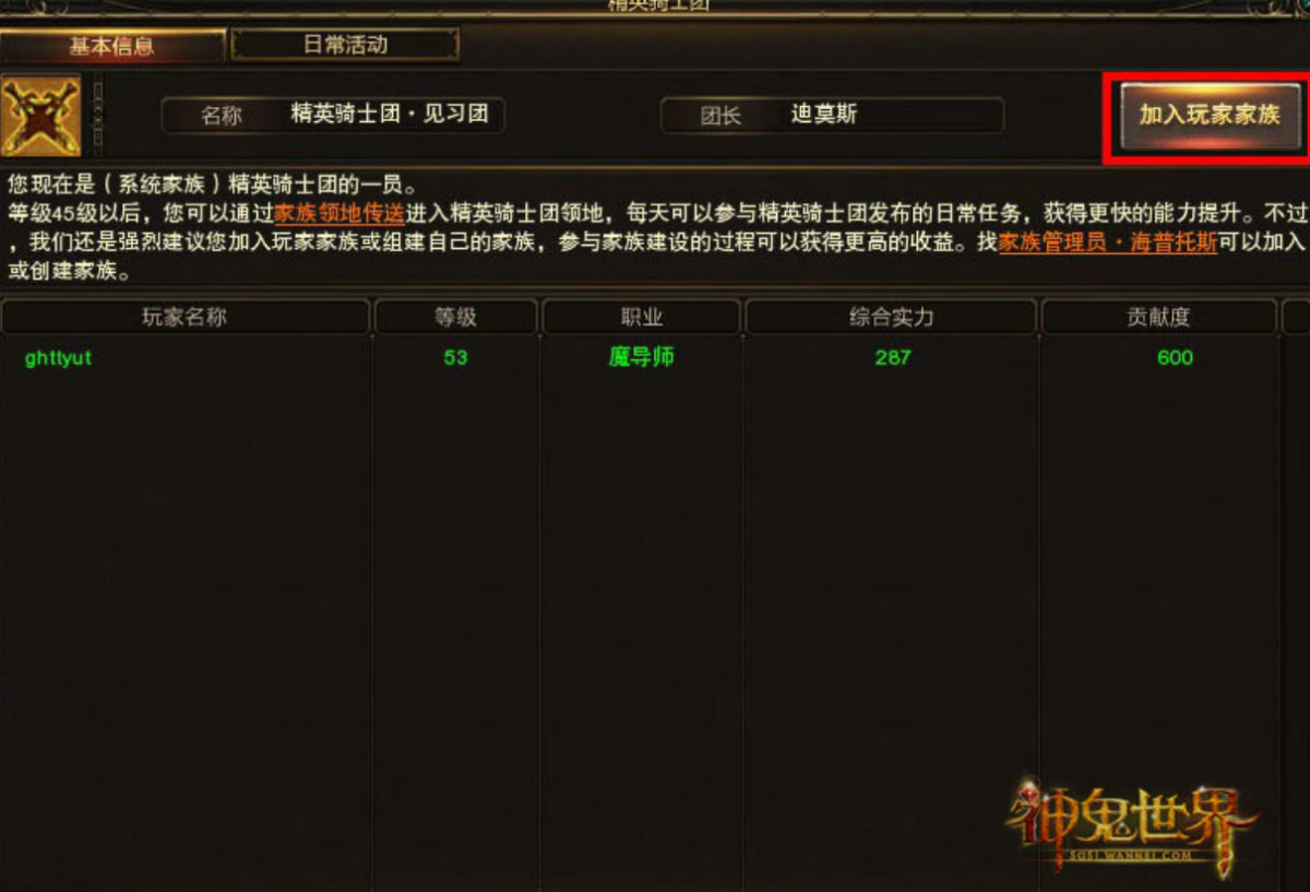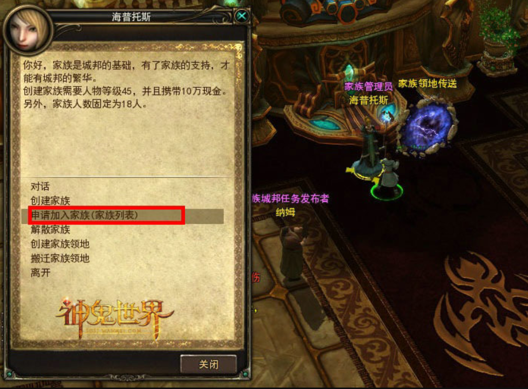 2、若您处于无军团状态,则可与军团管理员-海普托斯交谈,选择“申请加入军团”按钮,查看玩家军团列表。
