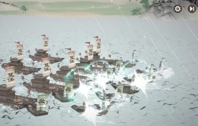 游戏里有四种功能不同的战船,楼船消耗200木材,能搭载3名弓兵,射程达到5格水域,适合远程压制敌人;蒙冲舰消耗50硫磺,配备着火油罐,能点燃敌船并造成持续燃烧伤害。
