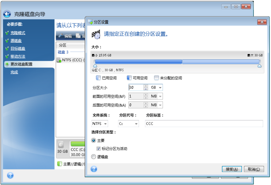 若文件系统不受支持或受到损坏,则 Seagate DiscWizard 可逐个扇区地复制数据。