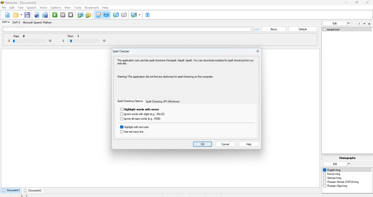 Balabolka是一个文本转语音(TTS)的程序,Balabolka可以使用计算机系统上安装的所有语音。屏幕上的文字可以被保存为一个WAV,MP3,OGG或者WMA文件。该软件可以读取剪贴板的内容,可以查看AZW,AZW3,CHM,DjVu,DOC,EML,EPUB,FB2,FB3,LIT,MD,MOBI,ODP,ODS,ODT,PDB,PDF,PPT,PRC,RTF,TCR,WPD,XLS和HTML文件中的文本,可自定义字体和背景颜色,控制从系统托盘阅读或者使用热键。 Balabolka使用微软的语音API(SAPI)的各种版本,它可以改变语音的参数,包括语度和语调。用户可以应用特殊的替代清单,以提高语音的清晰度质量。当你想改变的单词拼写时这个功能就非常有用。纠正发音规则使用regexp的语法。