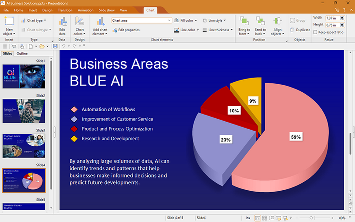 使用FreeOffice Presentations,您可以创建出色的演示文稿:借助令人惊叹的动画和幻灯片切换以及先进的母版页概念,您可以为任何演示文稿做好充分的准备。