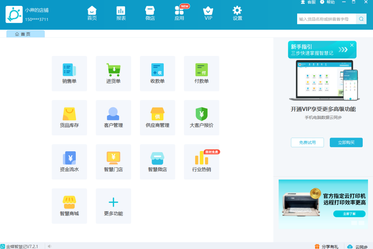 进销存基础功能免费使用,多店铺多店员可按需开通VIP。