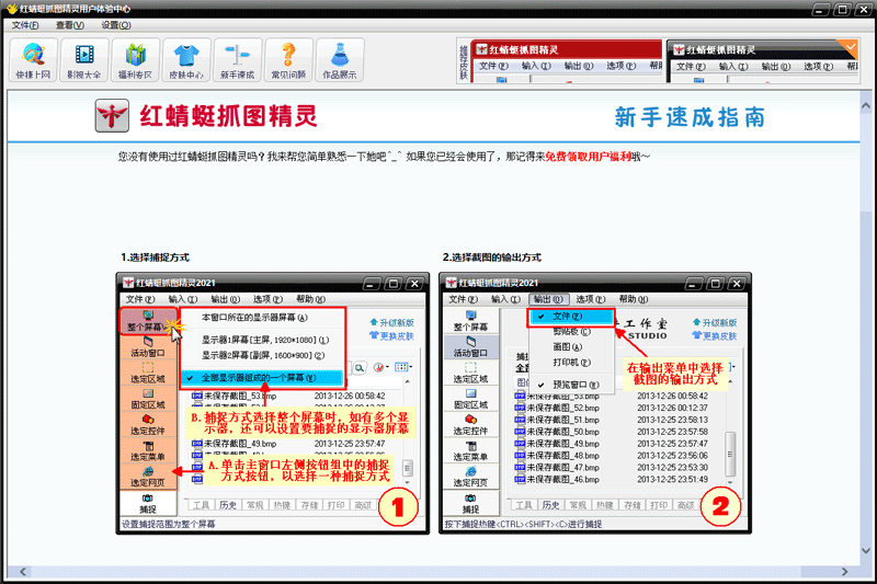 分别是整个屏幕、活动窗口、选定区域、固定区域、选定控件、选定菜单、选定网页。其中整个屏幕、活动窗口、选定区域、固定区域、选定控件等捕捉方式还支持多显示器环境:整个屏幕捕捉模式能够对任意一个主/副显示器的整个屏幕进行捕捉,也可以自动侦测捕捉主窗口所在的显示器屏幕,还支持将所有显示器的屏幕捕捉成一张截图;活动窗口、选定区域、固定区域和选定控件可以对多个显示器中的活动窗口/选定区域/选定控件进行跨屏幕捕捉。