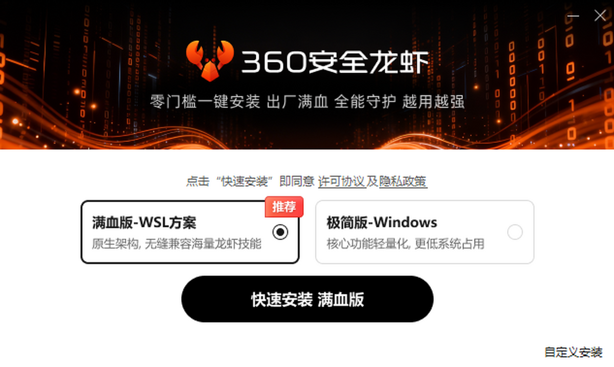 “360安全龙虾”一键极速安装,拥有16家顶级模型,21000+技能生态,360龙虾卫士护航,自动进化/自动安装技能,IM一键接入,开箱即用,无需复杂配置!
