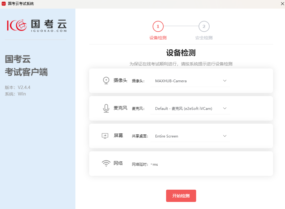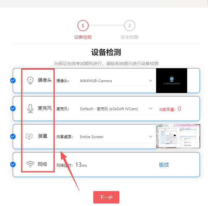 耐心等待设备检测完毕后,即可查看结果,可以查看摄像头、麦克风、屏幕以及网络情况。