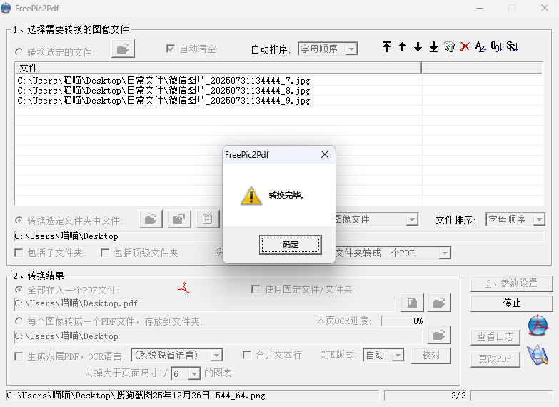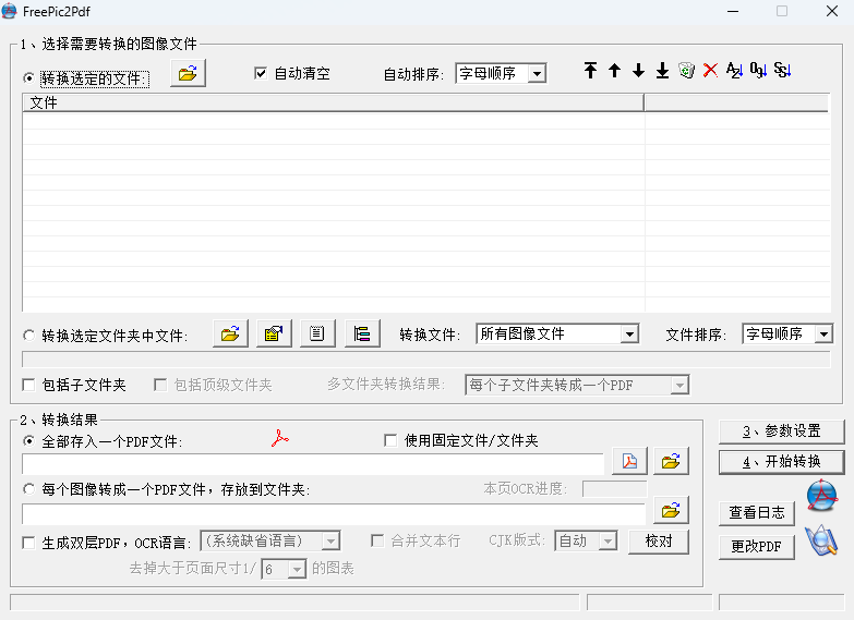 7.可以选择需要转换的文件,也可以指定需要转换的文件夹;可以指定文件排序方式(按字母顺序、按末尾数字顺序、按超星顺序);可以将所有图像文件合并到一个PDF文件,也可以每个图像文件分别转换成一个PDF文件。