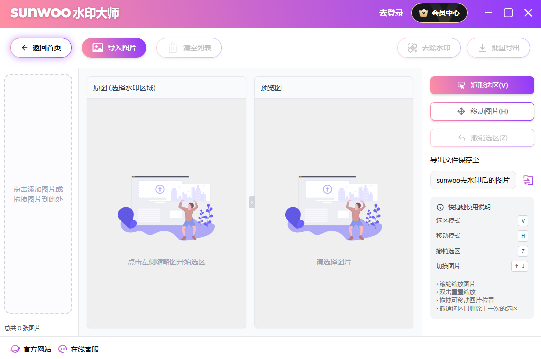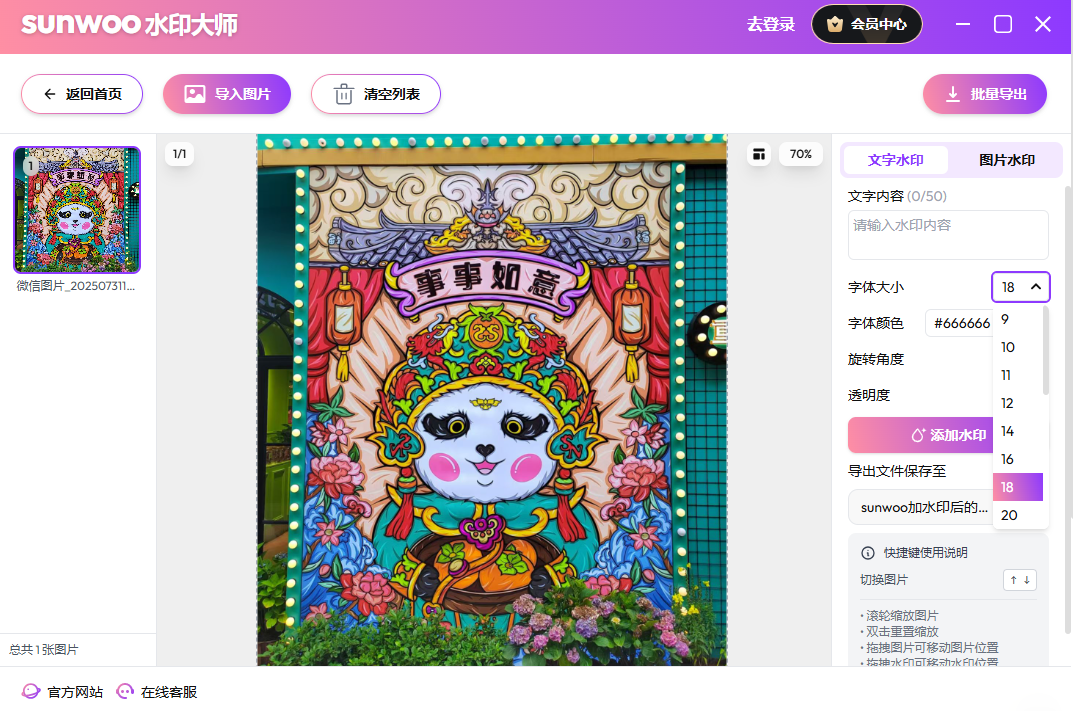sunwoo 水印大师支持添加文字水印和图片水印,支持自定义水印位置、大小、旋转、透明度,支持自定义模版和一键应用预设,支持预览水印效果。