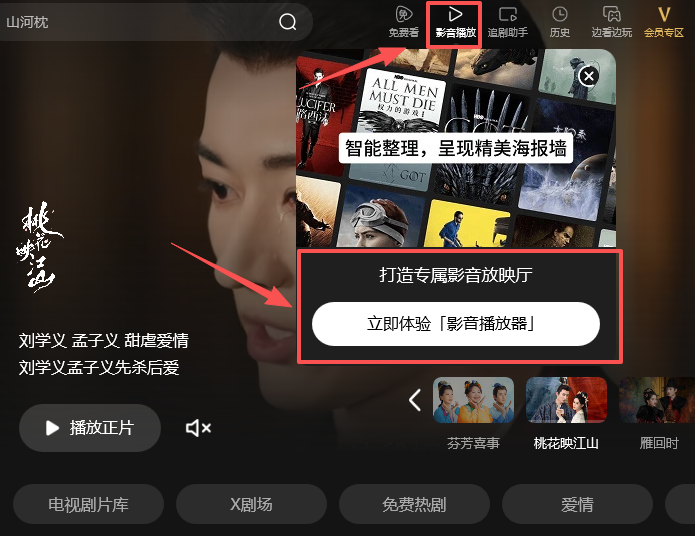1、鼠标指针放在首页左上方【影音播放】处,点击下方【立即体验影音播放器】,
