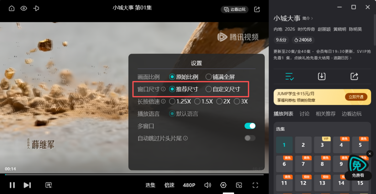 4、腾讯视频新推出自定义窗口尺寸设置,我们调整到合适的主界面窗口大小时,可以选择记忆当前尺寸,并且在下一次启动时生效该尺寸,而不是每次启动腾讯视频时都是默认尺寸,这让我们使用起来非常方便,优化了我们的使用体验。