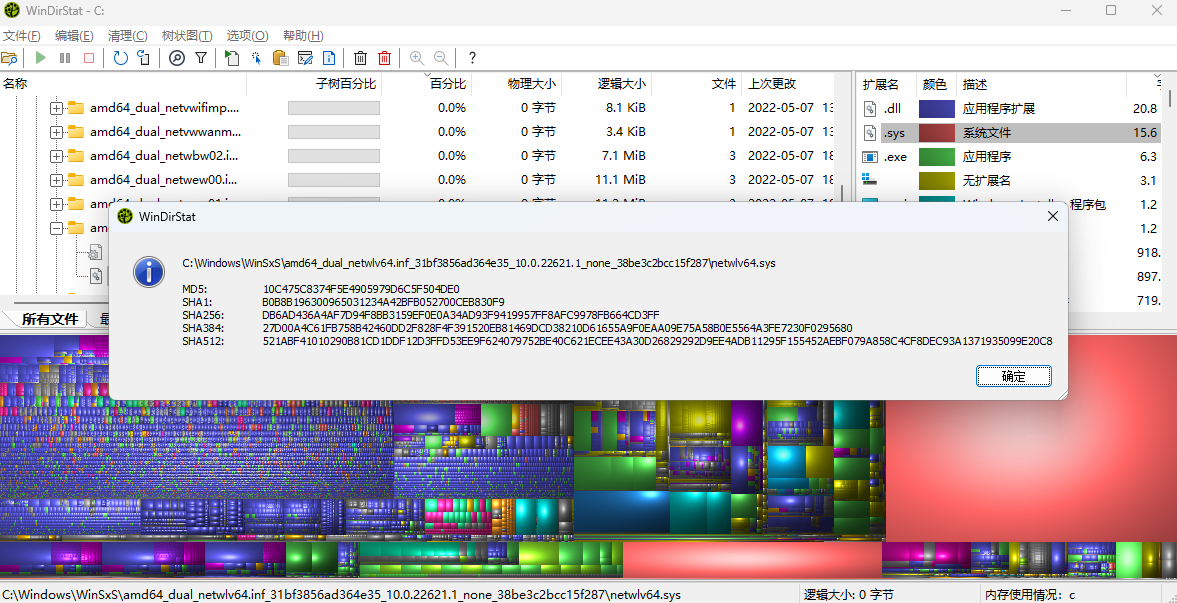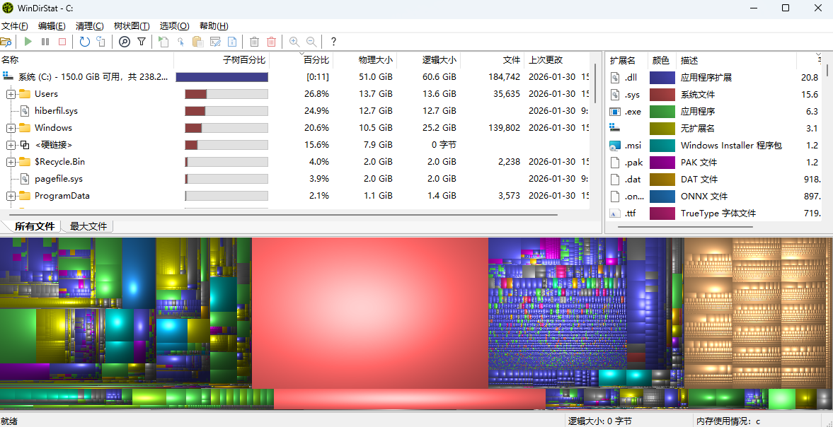 自动按文件扩展名统计占用空间,并可自定义扩展名与颜色映射,帮助分析哪些类型文件(视频、图片、文档等)占据了大块空间。
