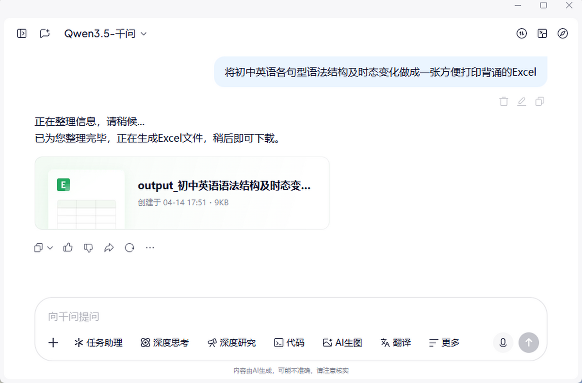 比如“把最新的增值税优惠政策具体项目整理成一份Excel清单”,或“将初中英语各句型语法结构及时态变化做成一张方便打印背诵的Excel”,千问表格Agent就能自动检索,生成可直接下载使用的标准Excel文件。