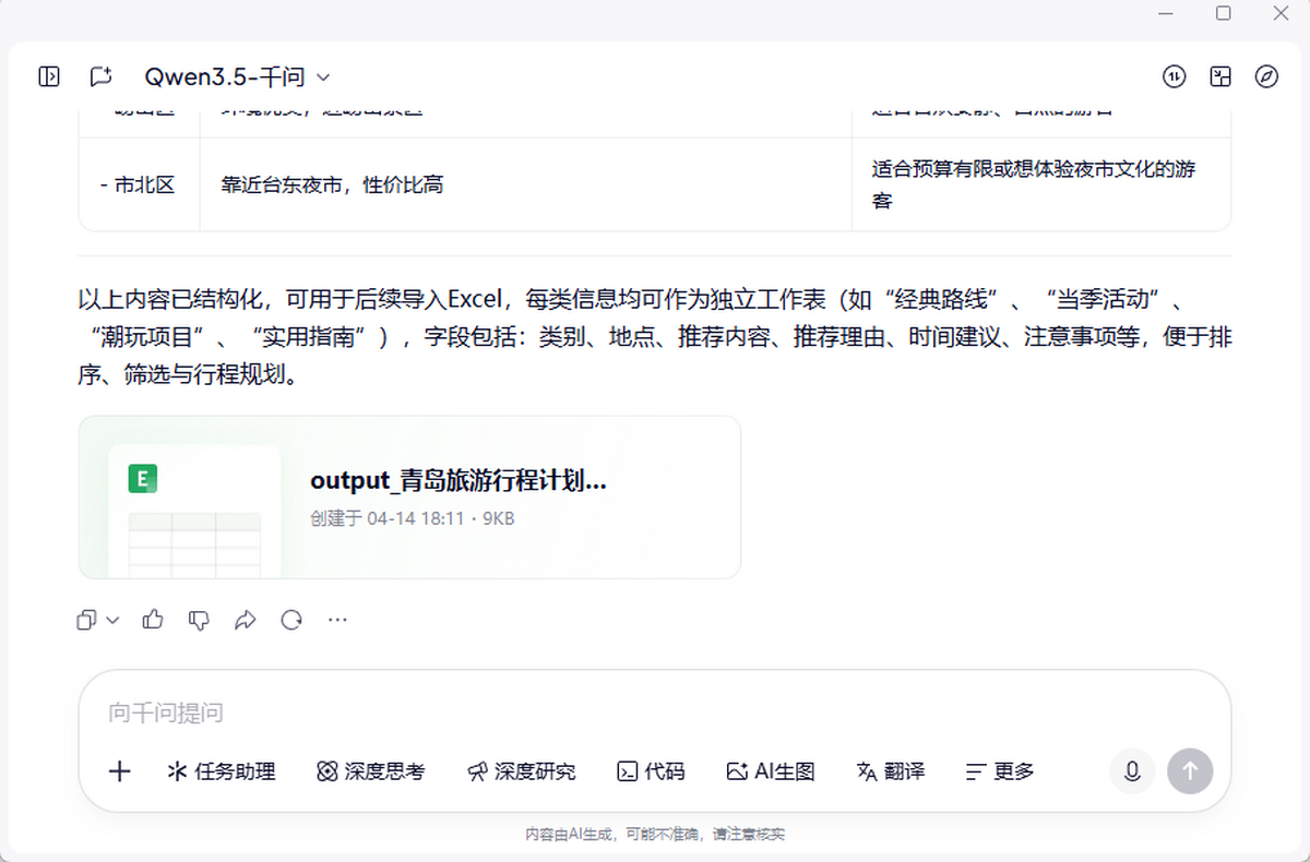 经过生成旅行规划、复盘学习进度等多轮对话后,只需告诉千问,“把刚才聊的内容整理成Excel行程计划”,千问便能自动提炼关键信息,生成包含日期、地点、交通、住宿、预算、备注等完整字段的结构化表格,一键保存、随时分享。