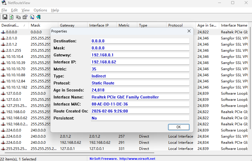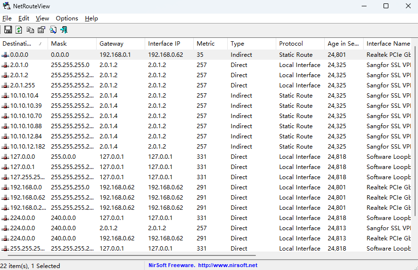 软件显示了当前网络上的所有路线清单,包括目的地,掩码,网关,接口的IP地址,公制值,类型,协议。NetRouteView主窗口显示您的所有网络路由列表,如'打印'在Windows路由实用程序的命令。你可以选择一个路线,然后将其删除(Del键)或修改它(按Ctrl + M)的。请注意,与'静态路由在本议定书仅列值的路线,可以删除或修改。也可以通过使用'新干线'选项(按Ctrl + N)的一个新的路径。