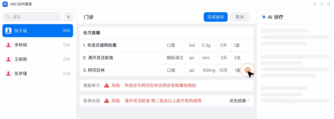 基于动态更新的医保政策大数据(含药品目录及违规案例库),AI 秒级审核处方并预警风险,降低医保处罚与拒付风险。