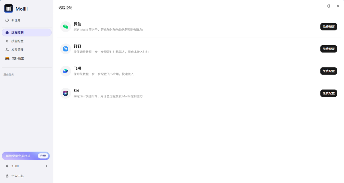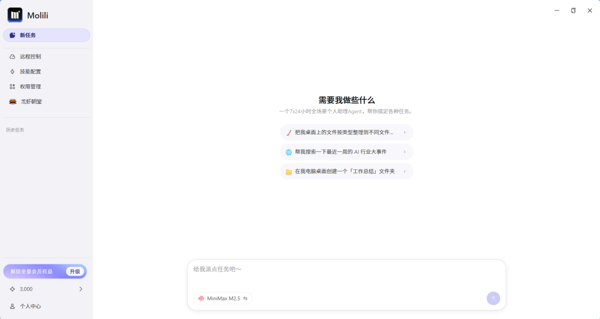 Molili 安装在你的电脑本地运行,直接操作你真实的文件和应用,真正能干活的助理。