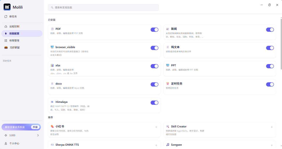 从日常办公、学习到生活小事,已经有一大批现成技能可以用,并且还在不断增加,让它越用越聪明。