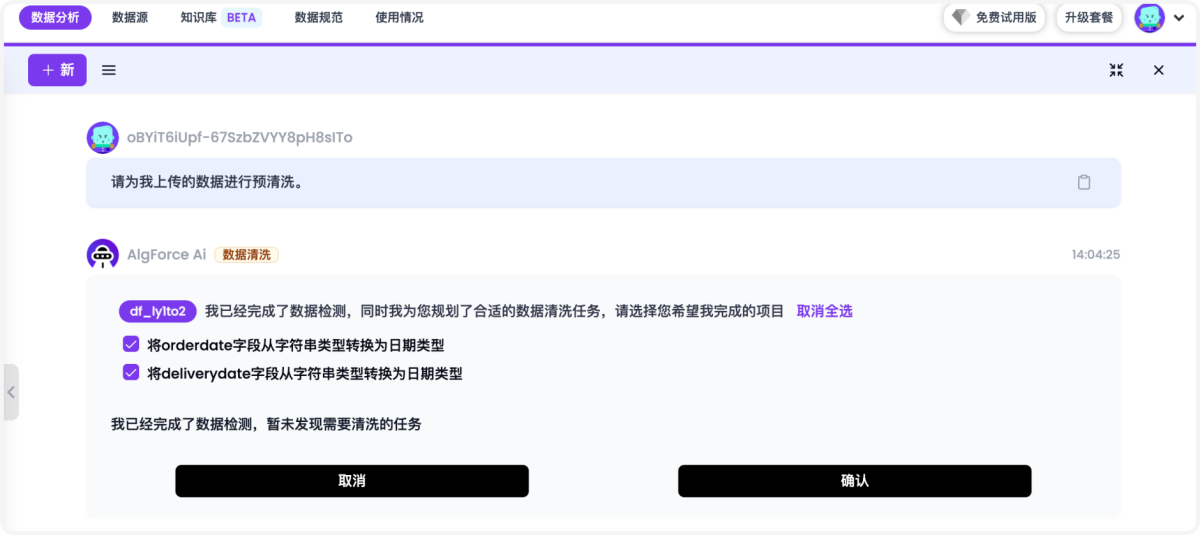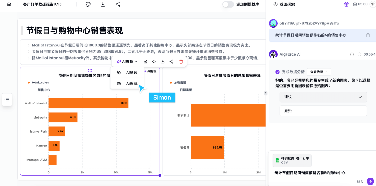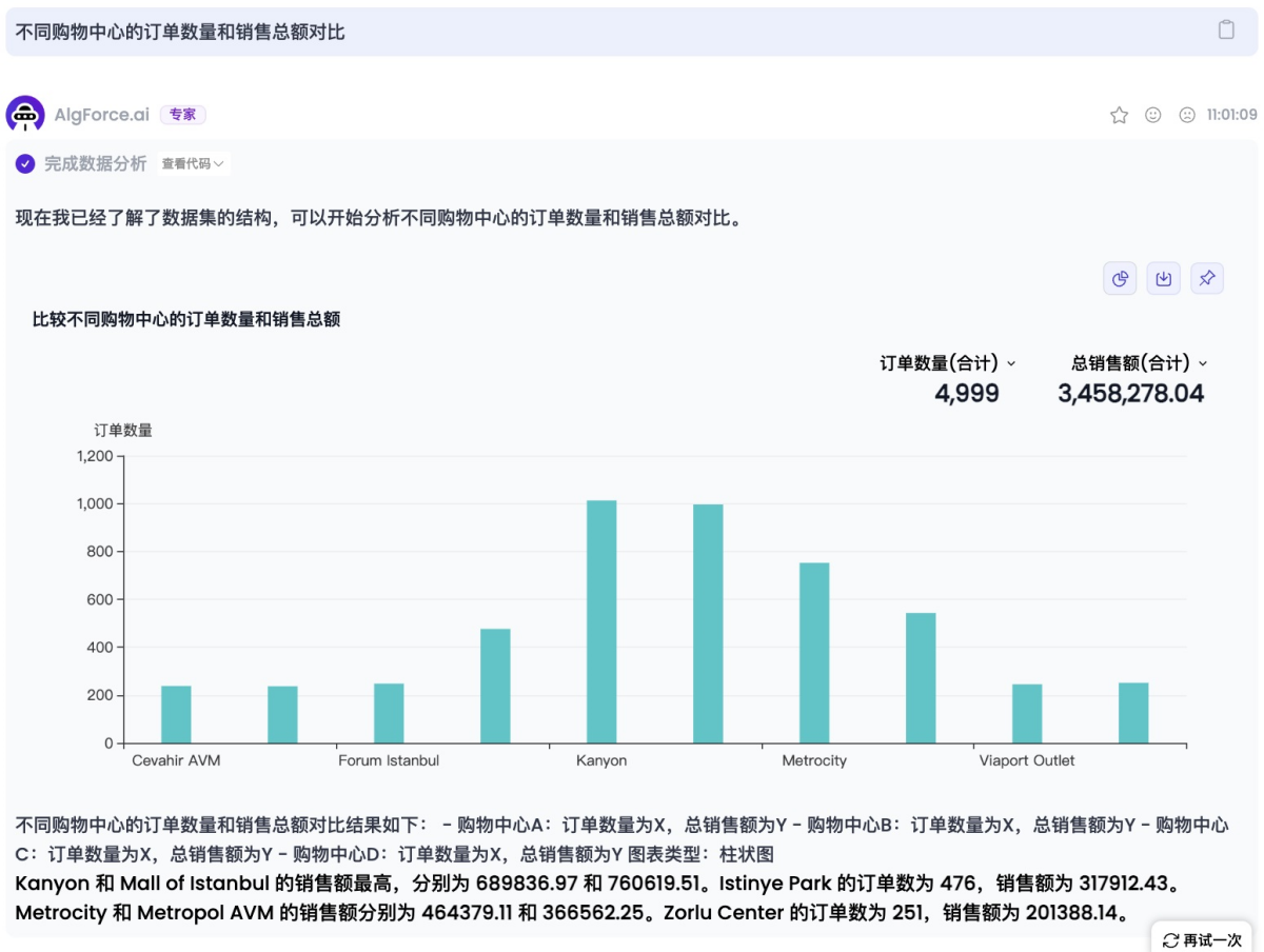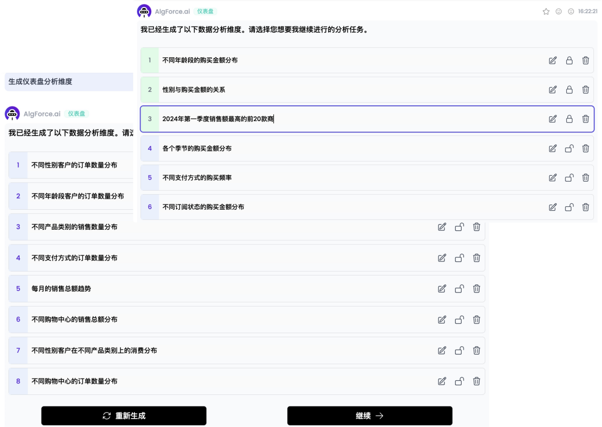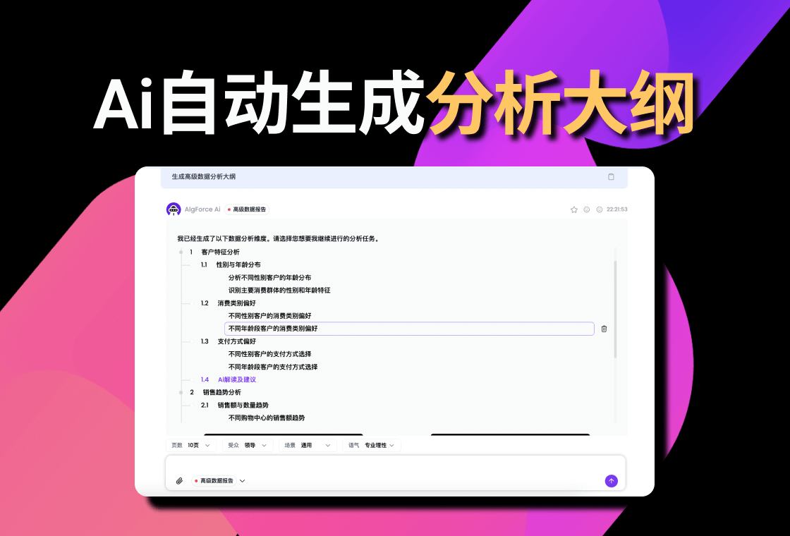 AlgForce Ai是私人数据智能助手,上传Excel文件,AlgForce Ai瞬间为您生成数据分析大纲,几分钟即可为您生成20页逻辑清晰、图表丰富的高级数据分析报告;24小时在线,实时为您解决数据问题。