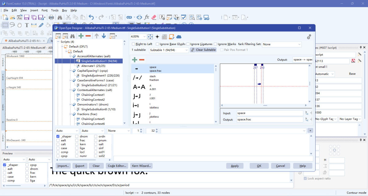 OpenType 布局设计器:保留所有现有 OpenType 功能,并以可视化方式编辑查找表,不丢失任何高级排版设置。内置 Adobe fea 编译器。