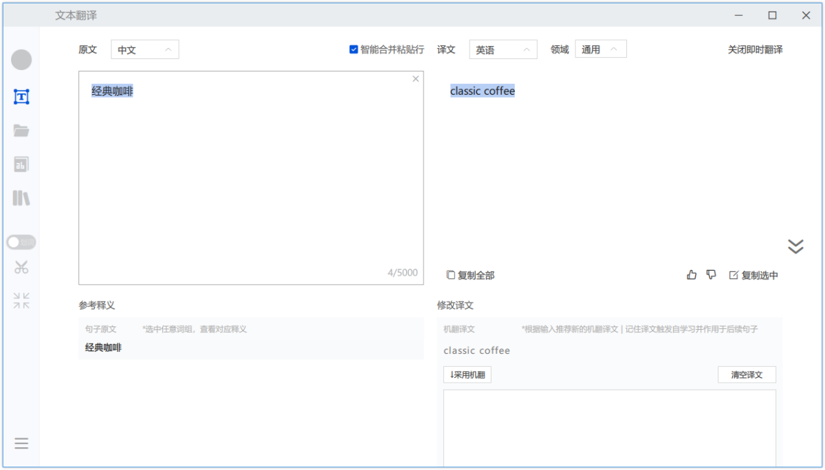 业内首个交互式机器翻译落地产品,提供译文片段智能推荐和整句补全,错误的机翻结果无需重复多次进行人工修订。
