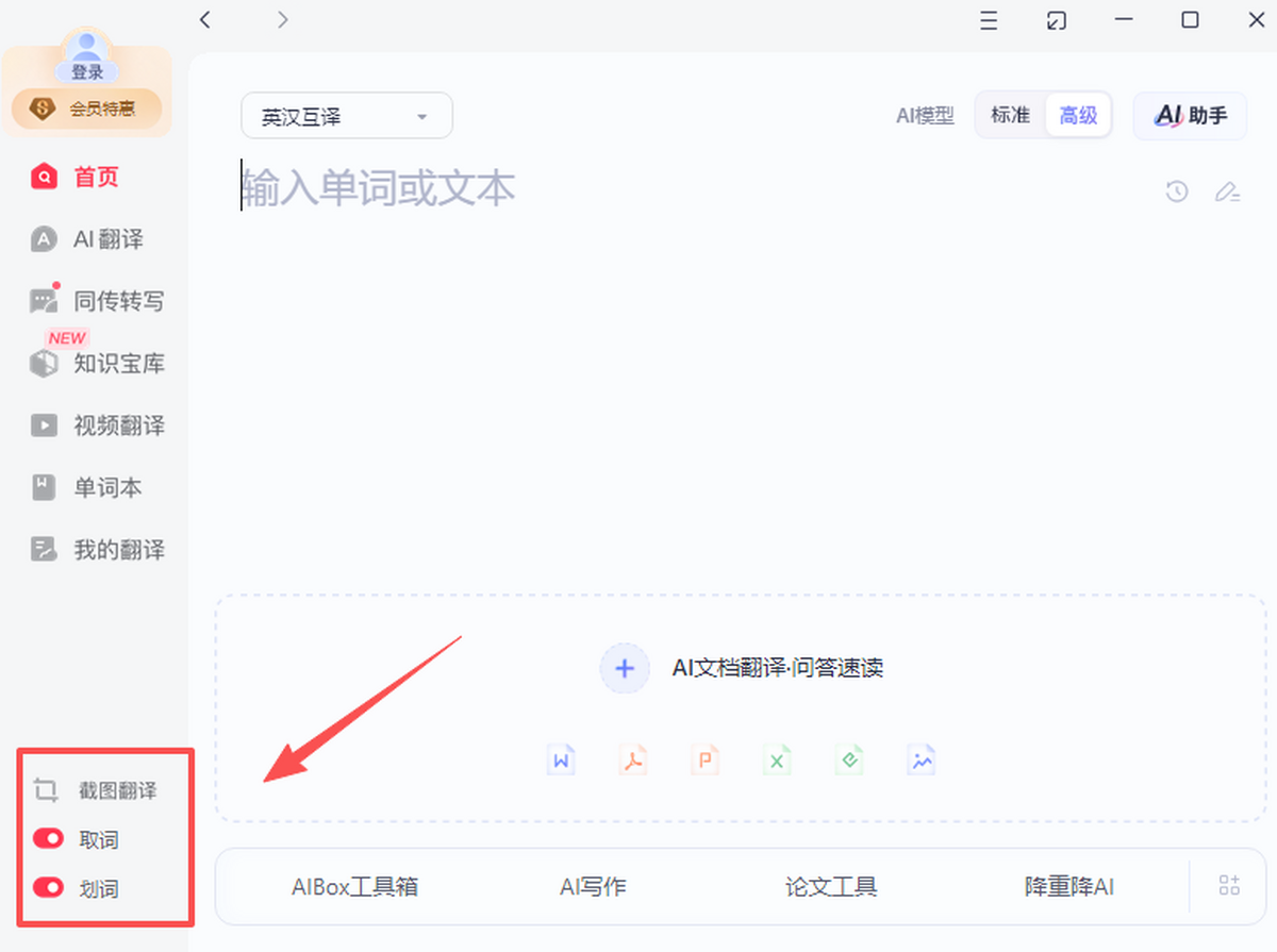 1、在有道词典面板的左下角选择 “取词”和“划词”按钮。