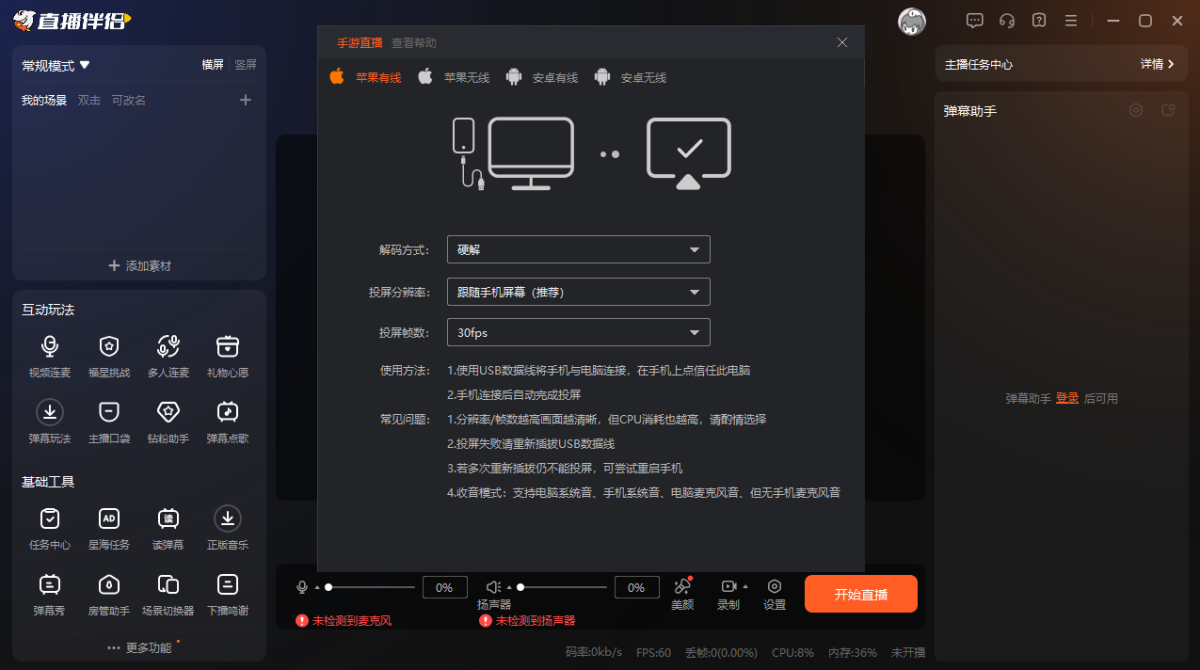 不同的直播内容,不同的网络、电脑环境,适合的直播参数不同,码率、分辨率、帧数并非越高越好,发现卡顿、丢帧时可适当降低相应参数