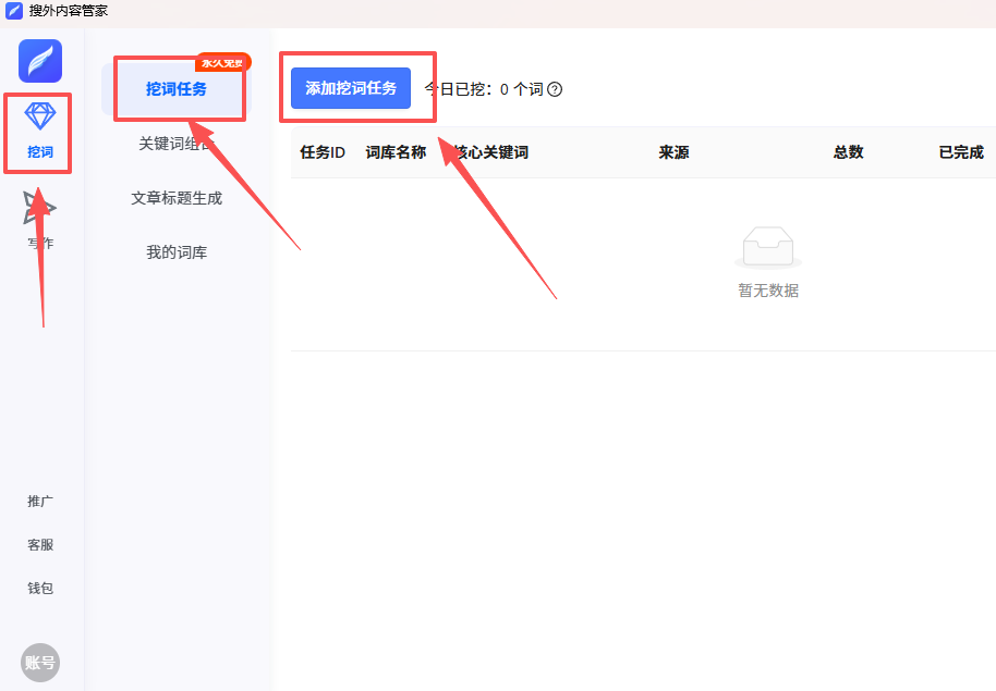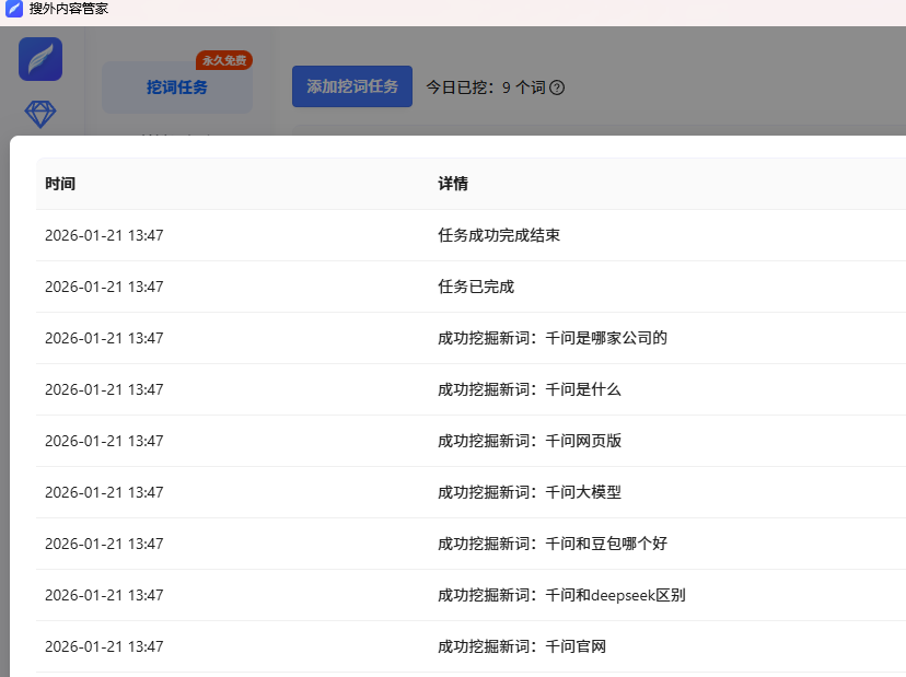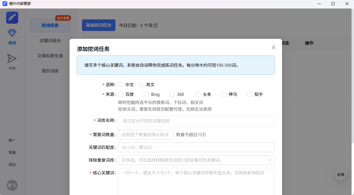 搜外内容管家提供免费的关键词挖掘、文章采集、问答组合功能,同时支持将文章自动发布到网站上。内容关键提供从关键词自动挖掘,文章自动创作,文章自动发布,全自动文章实施方案,让你做站更轻松,行动起来吧。搜外内容管家,只要设置核心关键词,软件会自动根据核心关键词挖掘更多的长尾词,并且只保留和核心词相关的词。