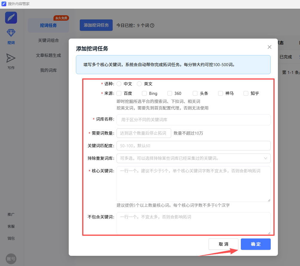 你只需要提供核心关键词,软件将会自动根据你提供的核心关键词,进行长尾词挖掘,直到达到你指定的数量。