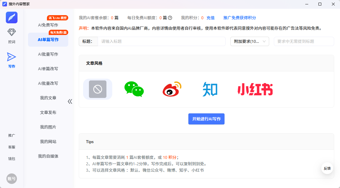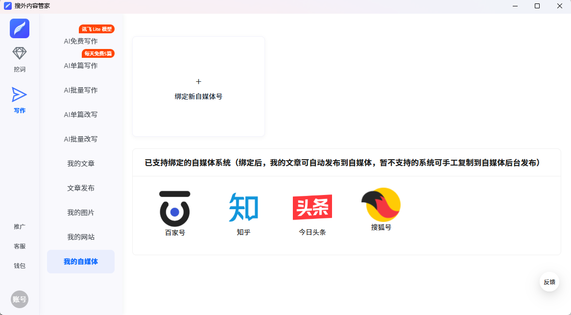 绑定你的网站/百家号/知乎等自媒体平台,软件就会自动将创作出来的文章发布到你的网站/自媒体平台。解决了文章发布的问题,从而减轻文章发布工作。