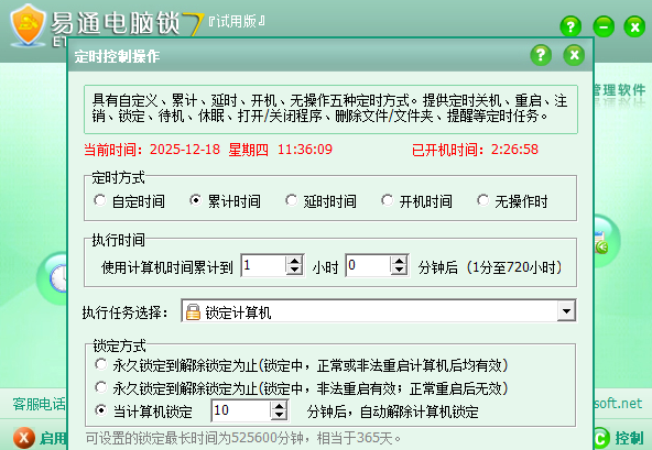 提供了自定、累计、延时、开机、系统无操作五种定时方式。定时任务提供了定时关机、重启、注销、锁定、待机、休眠、提醒、打开或关闭程序、删除文件/文件夹、备份文件/文件夹、断开网络拔号连接等操作任务。