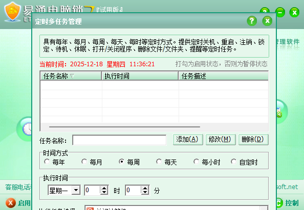 可随意按每年、每月、每周、每天、每小时等定时方式来制定定时任务。定时任务提供了定时关机、重启、注销、锁定、待机、休眠、提醒、打开或关闭程序、删除文件/文件夹、备份文件/文件夹、断开网络拔号连接等操作任务。