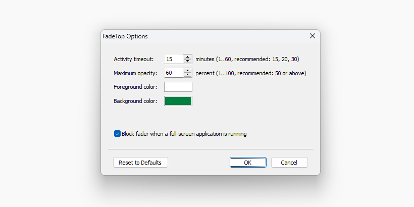4、可设置提醒间隔时间、渐变时间以及透明度,颜色、字体大小等。设置完成后可以在托盘里的 fadetop 右键 Show Fader 测试效果
