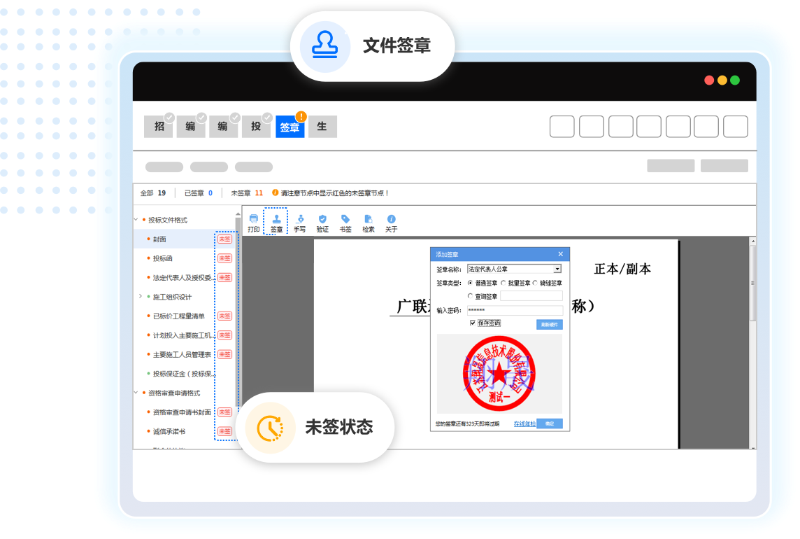 针对已编制完成的章节,进行签章操作;
