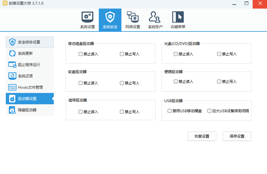 包括安全综合设置、系统更新、阻止程序运行、系统还原、hosts文件管理。
