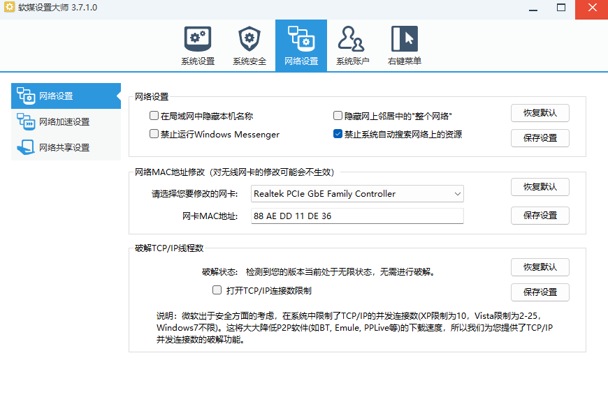包括网络加速设置、网络共享设置、网络mac地址修改等。