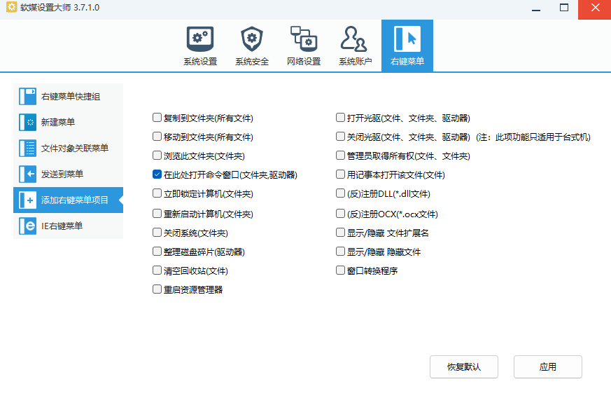 包括新建菜单、文件对像关联菜单、发送到菜单、添加右键菜单项目、ie右键菜单。