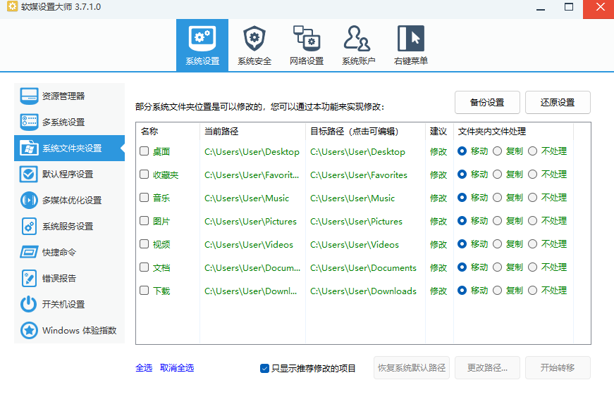包括资源管理器、多系统设置、系统文件夹设置、默认程序设置、隐藏驱动器、快捷命令等。