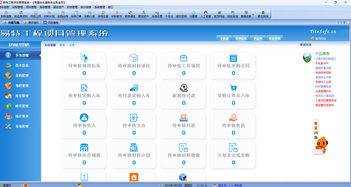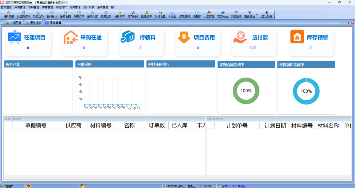 易特工程项目管理系统标准版是一款项目材料库存管理软件,主要功能为项目立项,工程材料预算,采购订单,采购入库,工程领用,工程结款,供应商欠款管理,包含物资出入库增强版的所有功能,以项目为核心,材料需用计划,采购合同,工程收款等,业务流程清晰,操作简单。