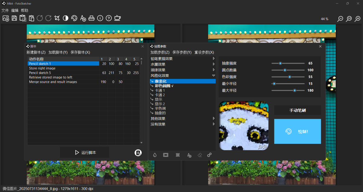 3、允许批量处理多张图片,手动修饰照片的部分区域,组合多种滤镜,甚至通过脚本功能创建自己的特效。