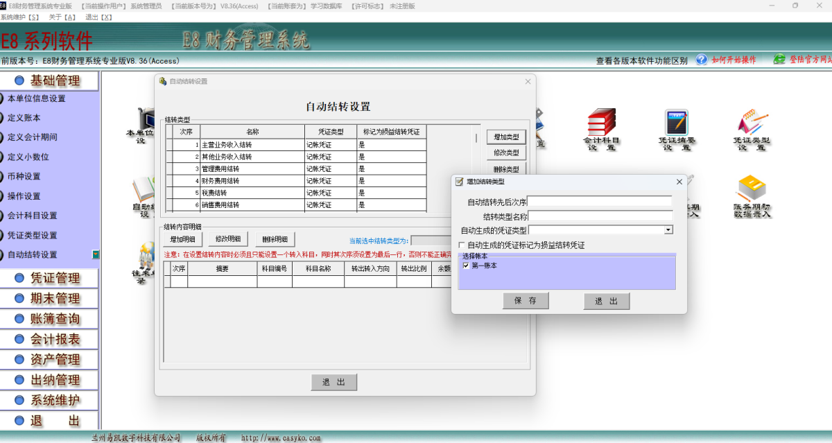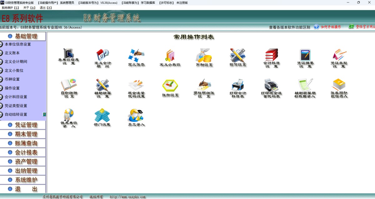 E8财务管理软件专业版包括凭证的编制、修改、审核、查询、打印,电子发票管理,固定资产管理,出纳管理等功能。软件自动计提折旧、自动结转损益、自动登帐、自动结帐、自动计算生成各科目汇总余额及会计报表、自动生成日记帐、明细分类帐、总分类帐和多栏帐,凭证批量导入,期初数据批量导入,自动化功能非常高,极大减轻了操作用户的工作量。可用不同格式进行综合查询、打印输出。