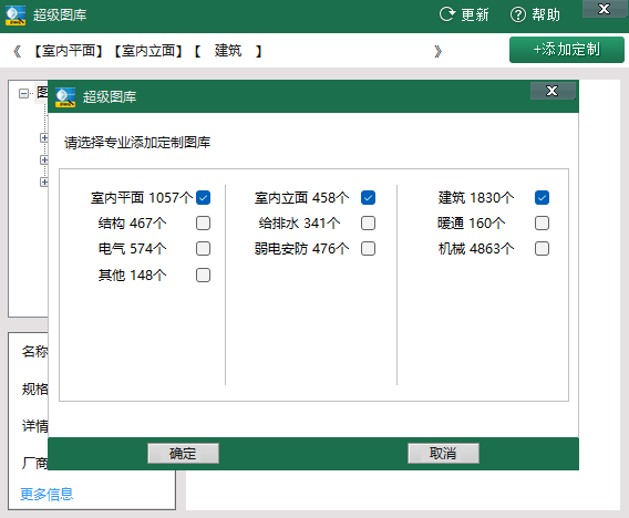 4.CAD超级图库电脑版首次使用,点击"添加定制"> 选择适合您的专业,即自动更新,在线下载海量的图库图例;