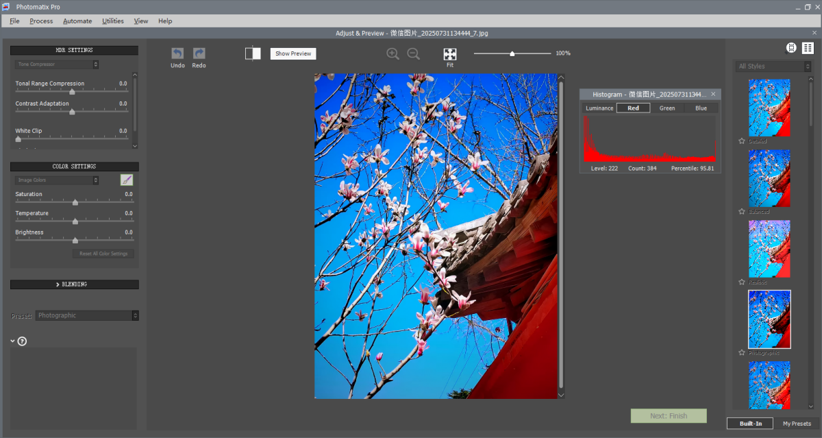 除了 HDR 处理外,还支持对单张照片进行色彩调整、白平衡校正、降噪等操作,提高照片的质量。