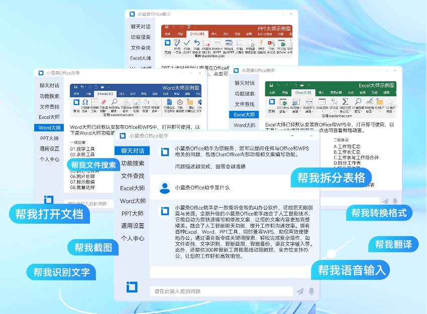 采用了AI语音交互技术,让用户不仅能通过语音(普通话/方言/英语等)输入文字,还能通过语音输入指令轻松完成复杂的Excel、Word、PPT操作。同时小蓝条Office助手还支持文件查找、文字识别 、翻译、智能截图、智能备份、打开程序等功能。