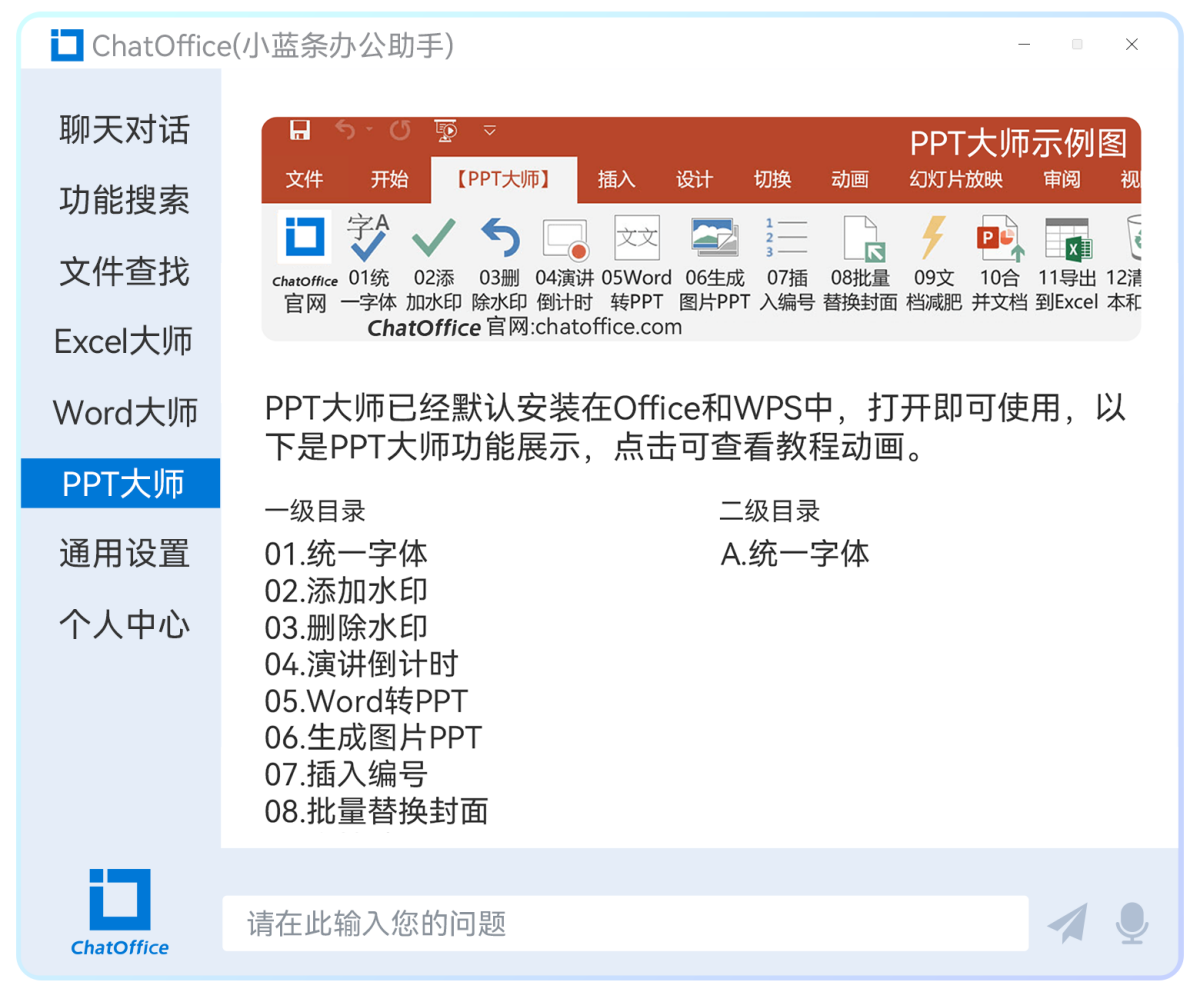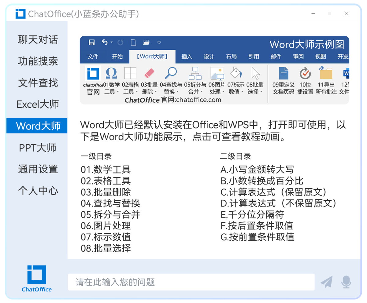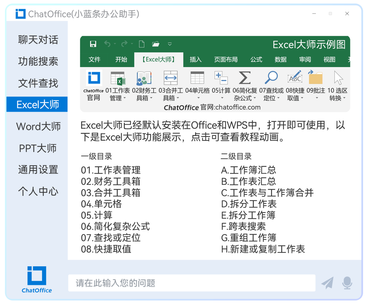 包含Excel大师、Word大师、PPT大师三大模块,拥有300多种Excel、Word、PPT的智能工具,并配备优质的离线动画教程资源,有效降低了Office学习成本,实现百倍办公效率。小蓝条Office助手全面兼容Office和WPS,下载安装后Office大师将自动安装到相应软件中。