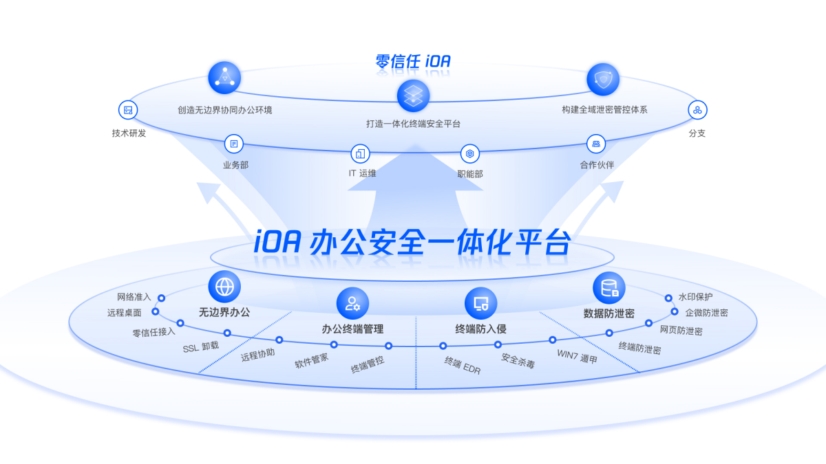 腾讯iOA,腾讯自研自用的办公安全一体化平台,为企业创造安全、高效、稳定的办公环境。融合远程办公访问接入、终端防入侵、数据防泄密、办公终端管理等能力,帮助员工随时随地高效办公。