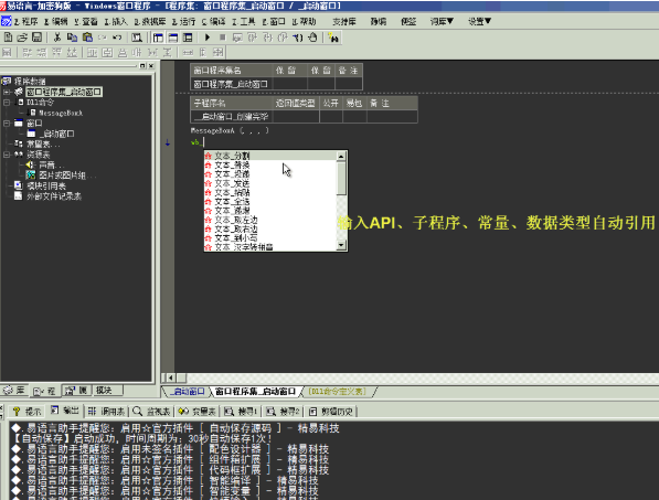 可以在易语言直接调用词库中的API、常量、数据类型,也可以在易语言里输入完整的API函数,再回车也会自动插入到易语言里,并支持在线同步更新;