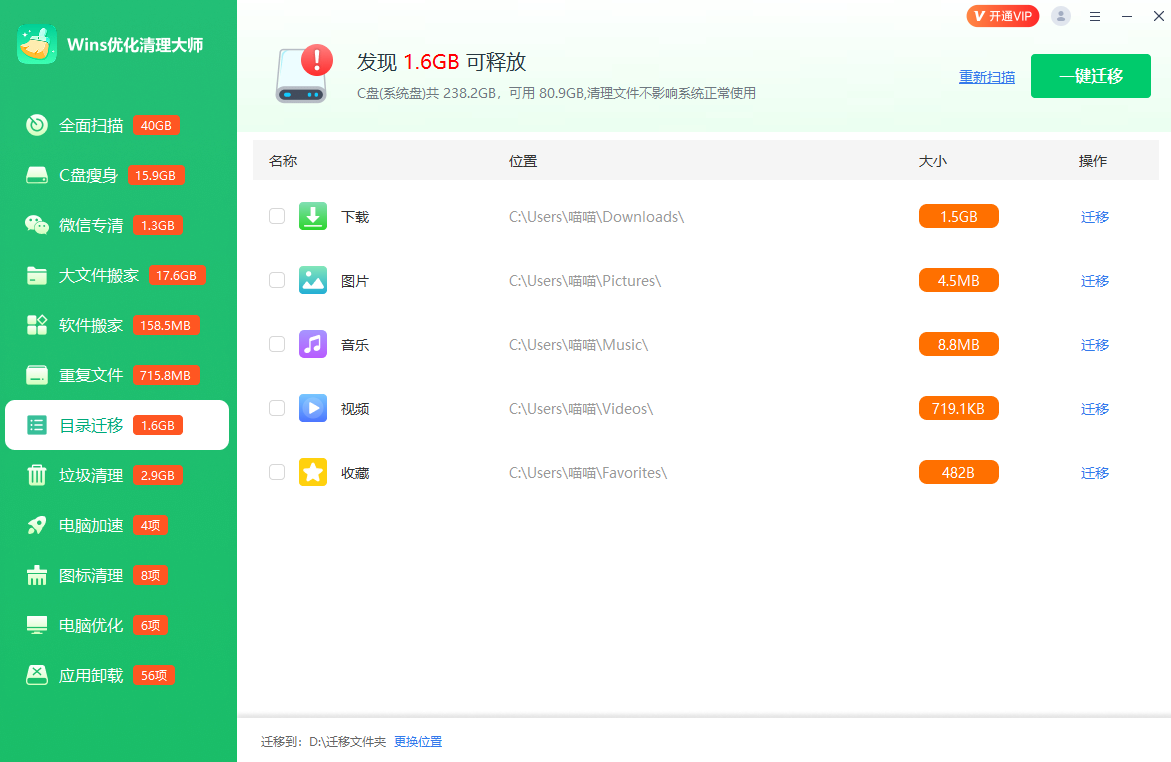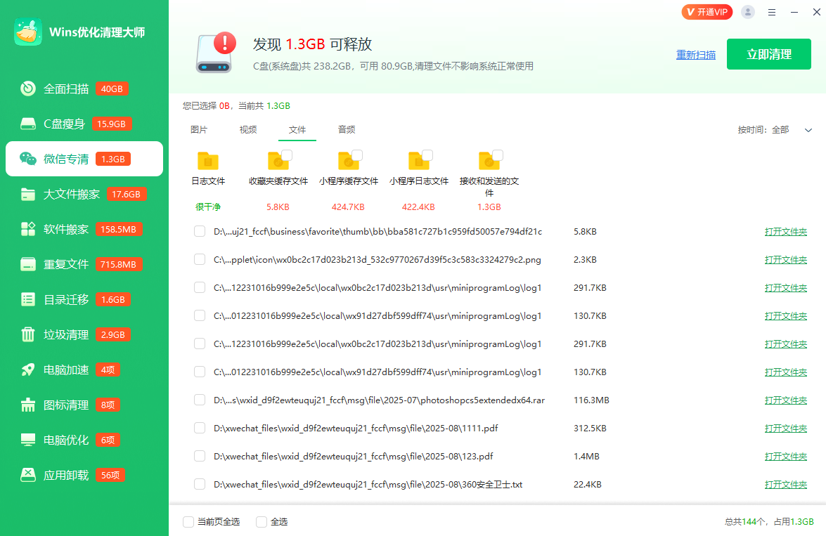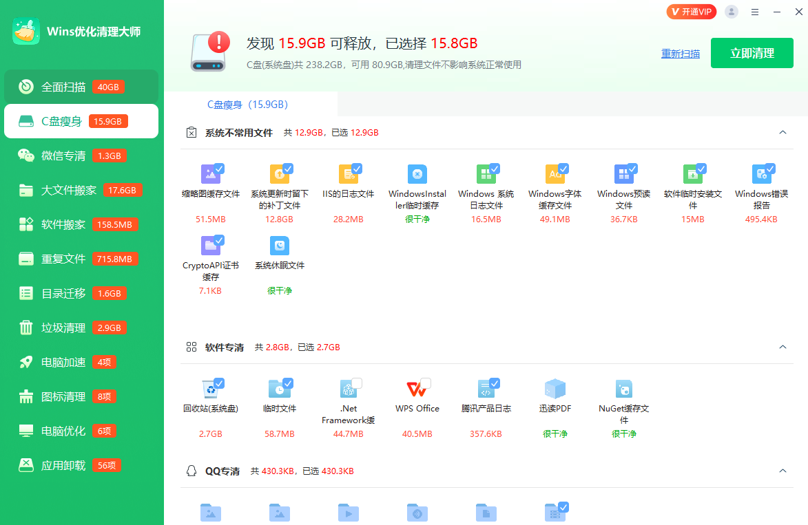 支持特定软件的清理,如微信专清、QQ专清、软件专清等,能智能识别并清理C盘不常用的系统文件,轻松解决C盘空间不足的问题。