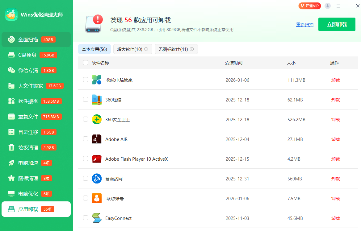 Wins优化清理大师是一款为Windows系统性能提升而打造的实用工具。它具备系统清理、优化、软件专清、C盘瘦身等多种功能,可智能检测并清除回收站、临时文件、缓存、日志文件等系统垃圾,以及聊天、浏览器产生的冗余数据,还能安全移除无效注册表项。针对开机速度、内存占用等场景,它能提供优化方案,解决电脑卡顿、开机慢等问题,还支持特定软件清理,助力用户一键解决C盘空间不足难题。